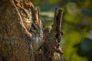 A mother and juvenille Indian scops owl snoozing in a hole of a tree branch.