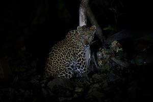 A leopard looking towards the photographer in between her meal, there's a large buffalo next to her. Photograph was taken during Night Safari (India)