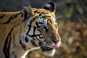 A close up showcasing the tiger looking ahead, with her tongue out.