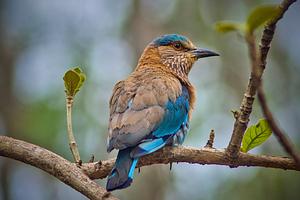 Look at this absolutely gorgeous bird! It has a pinkish face and throat, a brown head and back, with blue on its rump and contrasting light and dark blue on its wings and tail.
