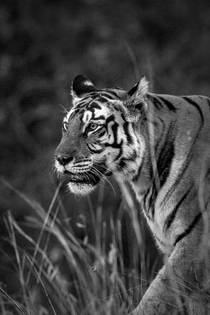 A monochrome photograph of a tigress from Panna National Park, it was photographed early morning, just as we entered the jungle, we managed to see this beautiful animal!