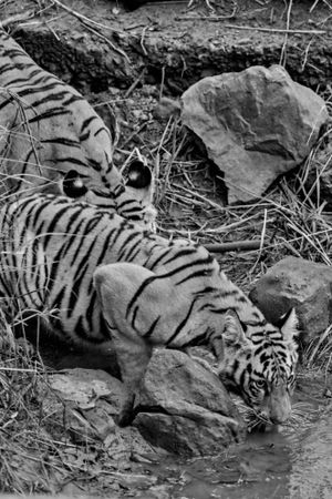 A black and white photo of a tigress and her cub drinking water from a stream. the cub is in front and hiding the face of the mother. there are grass and stone around them.