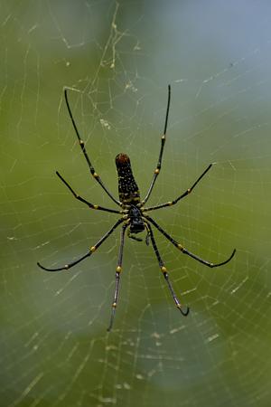 Close up of a spider, you can see the ventral side of the spider - it has yellowish spots. there is a large red bump (possibly the spinneret). there are yellow spots near each joint of the leg.