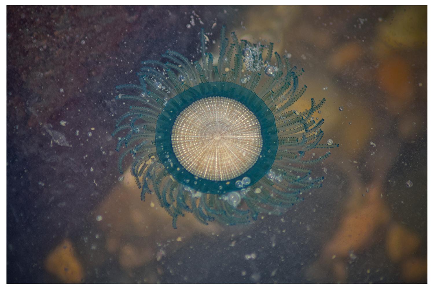Porpita Porpita (blue button) they are a floating colony of marine life, you see a floating disk with radial lines, and a blue outer ring, there are blue tentacles as well all around the disc.